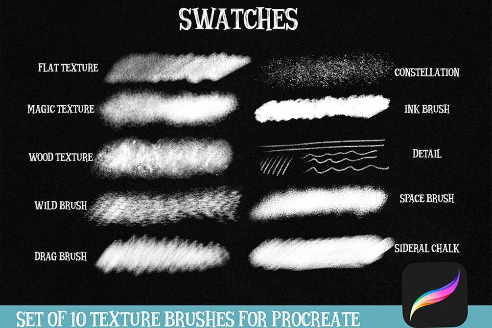 El paquete incluye: 10 pinceles: -Flat texture -Magic texture -Wood texture -Wild brush -Drag brush -Constellation -Ink Brush -Detail -Space brush -Sideral chalk